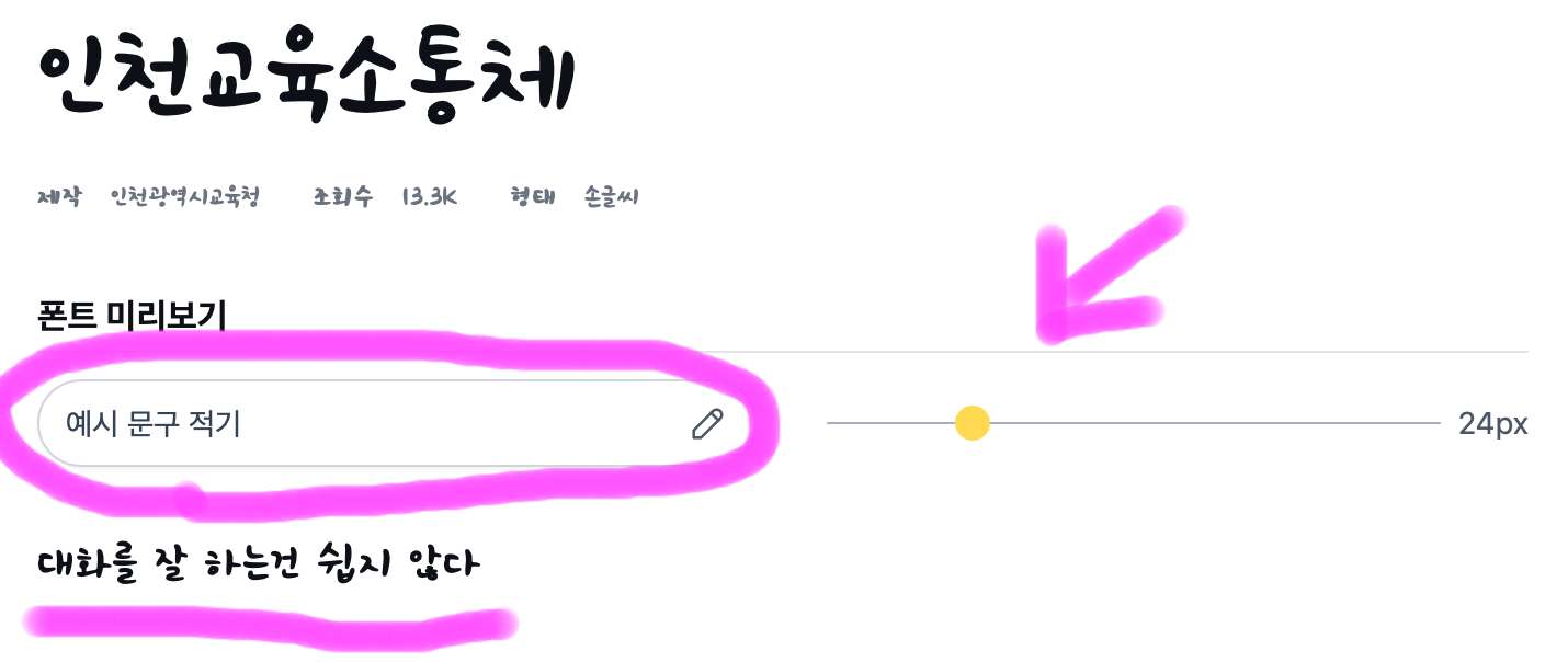 예시 문구 적기에 원하는 글씨를 적어 아래에 폰트 글씨체를 테스트해 볼 수 있고 오른쪽에는 글씨 크기를 조절해 볼 수 있습니다.