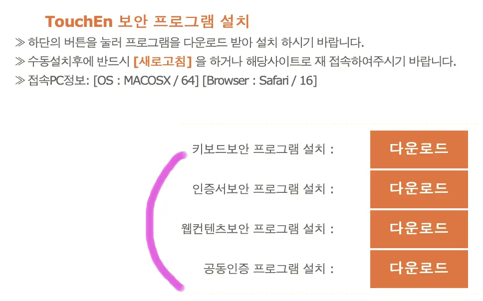 보안 프로그램을 다운로드를 클릭해서 하나씩 설치해 줍니다.